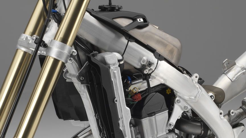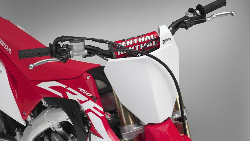 Die CRF450R wurde dieses Jahr in den Feinheiten überarbeitet. So wurde zum Beispiel ein neuer Lenker angebracht. Diese können um 26 mm nach vorne und hinten verstellt werden. Wenn die Halter um 180° geschwenkt werden, verfügt der Lenker zusätzlich über 10 mm erneut gewonnenen Spielraum. Dadurch wird die Anzahl der Sitzpositionen auf Vier erhöht, welche nun dem Fahrer zur Verfügung stehen.